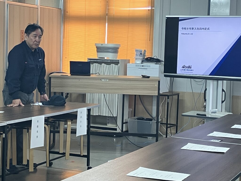 内定式 ~260~ 投稿日: 2026年2月16日 投稿者: 山形朝日 2月14日 2026年度入社の内定式を執り行いました。 2026年度入社予定の4名(第二新卒枠で既に入社している1名を含む)の内定式を、2月14日に開催いたしました。 当日はご家族の皆さまにもご出席いただき、内定式、工場見学、昼食会と、終始和やかな雰囲気の中で進行しました。 昼食会では、社長特製のカレーを囲みながら会話も弾み、内定者の皆さん同士の交流も深まりました。 新たな仲間を迎える、温かい時間となりました。